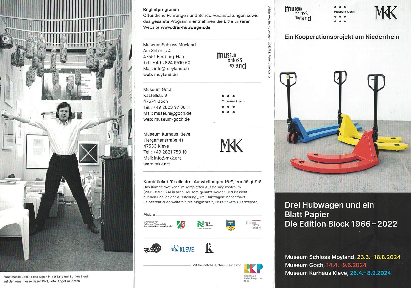 Mit seiner Edition Block schuf der Galerist René Block 1966 in Berlin ein Instrument zur „Demokratisierung und Sozialisierung des Kunstmarktes". Zu den 122 Editionen seines Verlags gehören Meilensteine wie die Skulptur „Der Denker" (1976/78) des koreanischen Medienkünstlers Nam June Paik, bekannte Multiples von Joseph Beuys wie „Schlitten" (1969) und „Filzanzug" (1970), das raumgreifende Objekt „Hubwagen" (2012/13) von Alicja Kwade, das der Ausstellung ihren Namen gibt, sowie mehrere Grafikmappen mit Beiträgen internationaler Künstler:innen.