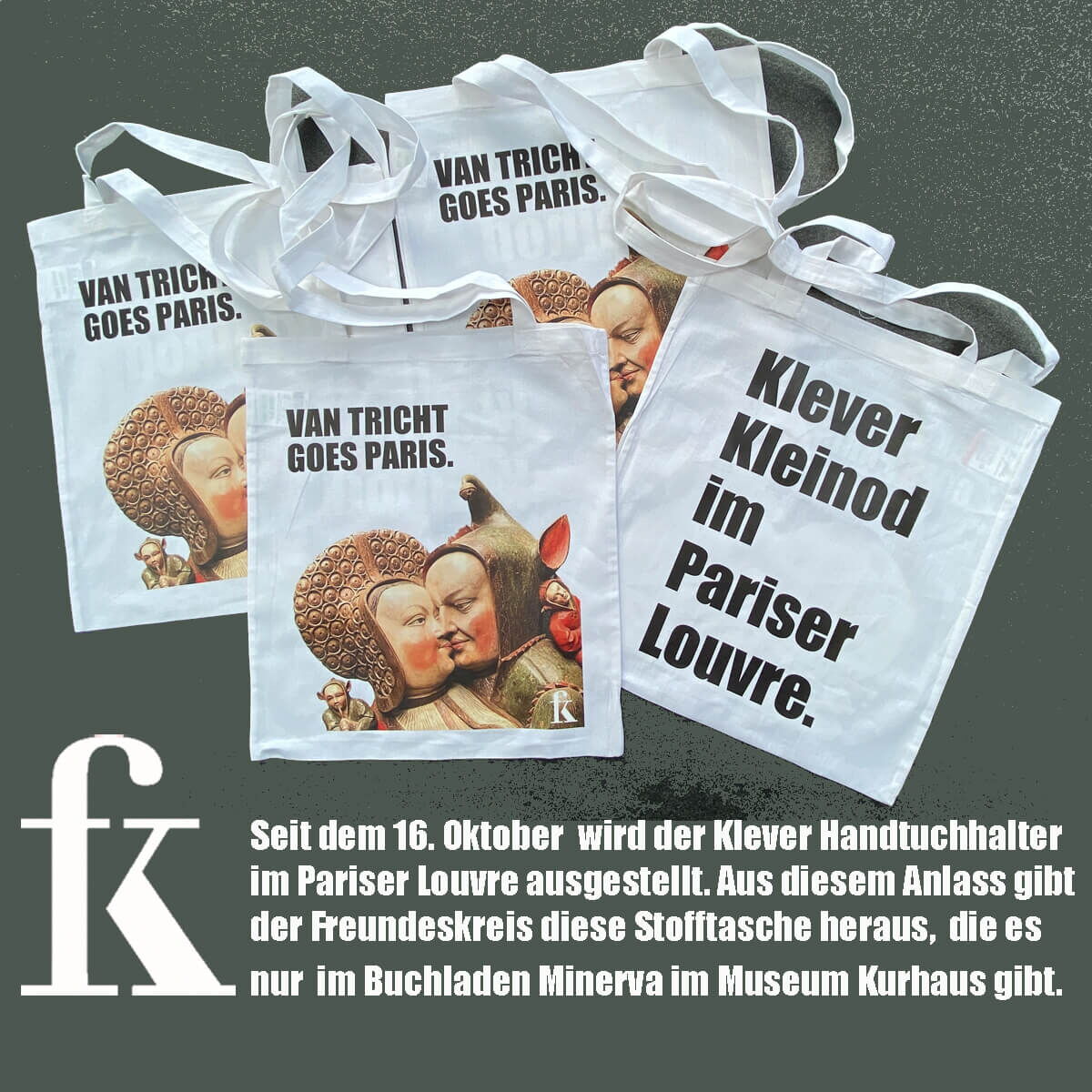 Der Stoffbeutel ist auch in der Buchhandlung Hintzen und im Einrichtungshaus Rexing zu erwerben, nur nicht im Louvre, wie uns ein Freundeskreis-Mitglied schrieb, das mit der Klever Tasche bereits in Paris war: "Unser" Handtuchhalter ist an prominenter Stelle ausgestellt, aber nicht nur das, schmückt auch Fahnen und Plakate im Stadtbild und diverses im Shop zur Ausstellung - nur die Beutel mit Bild haben sie nicht und hätten sie gerne!