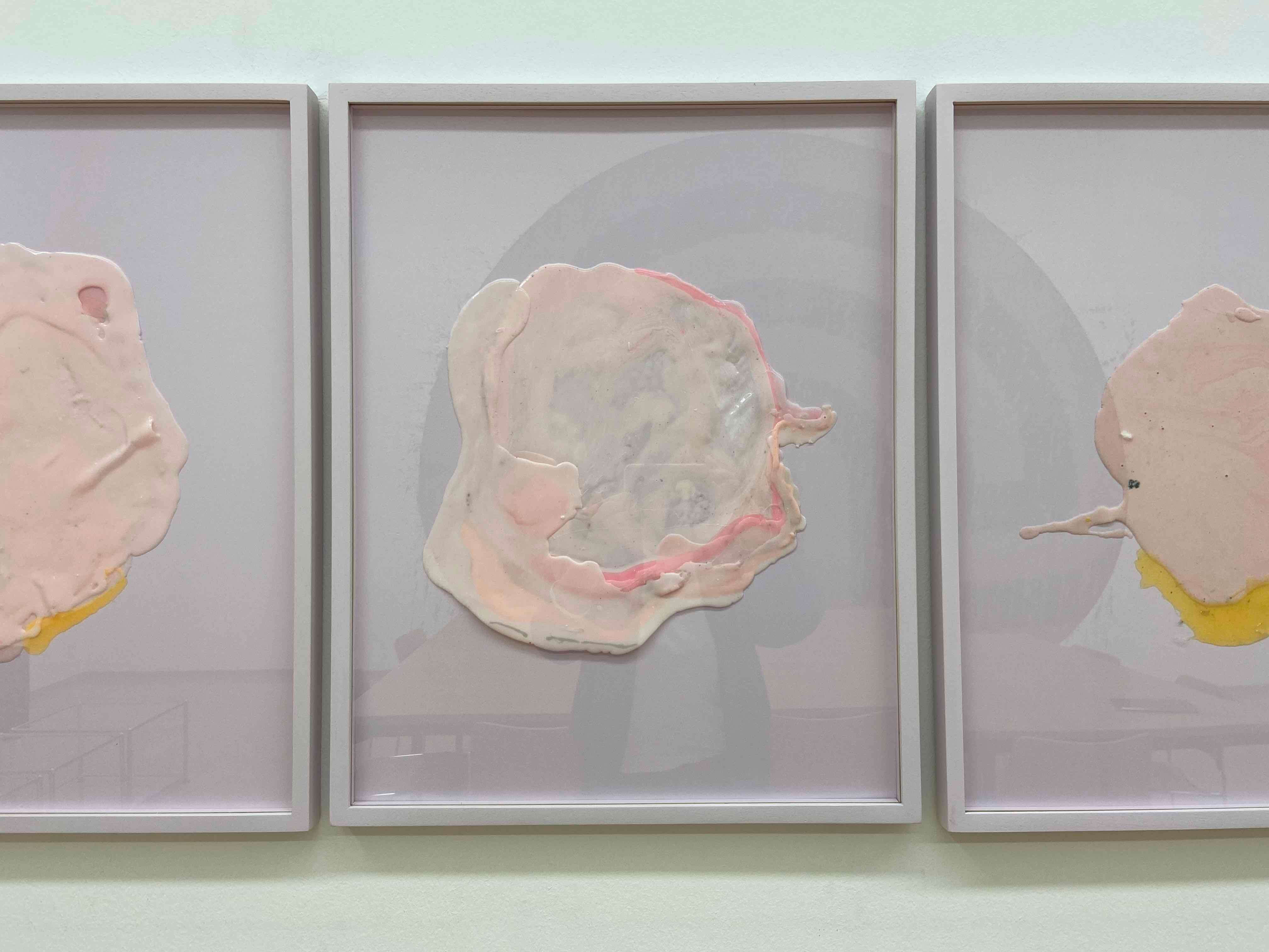 Die Werke bestehen aus Silikonflecken, welche die Künstlerin in Schichten auf den Boden gegossen hat. Durchsetzt von Glitzer, Staub und anderen Überresten zeugen Sie von den Mythen und Realitäten eines Künstlerateliers. Immer wieder thematisiert Dieckwisch die Malerei, macht dies aber anhand von skulpturalen Mitteln und mit Materialien wie Silikon, Keramik, Textil und Fotografie (SF).