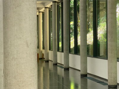- Zum bewaldeten Berghang wurde die Säulengalerie mit großer Fensterfront ergänzt, die Natur so ins Museum einbezogen.