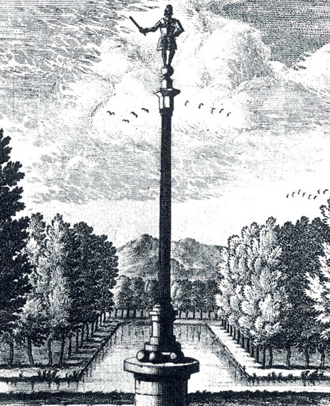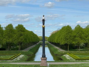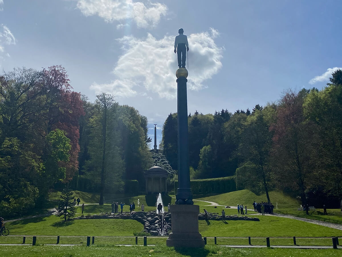 Der Neue Eiserne Mann steht an der Stelle, an der Johann Moritz 1653 nach den Wirren des Dreißigjährigen Krieges ein Siegeszeichen (Tropaion) errichtete, om voor een teycken van den soeten vreed te groeten (Maria van Akerlaeken, 1653).