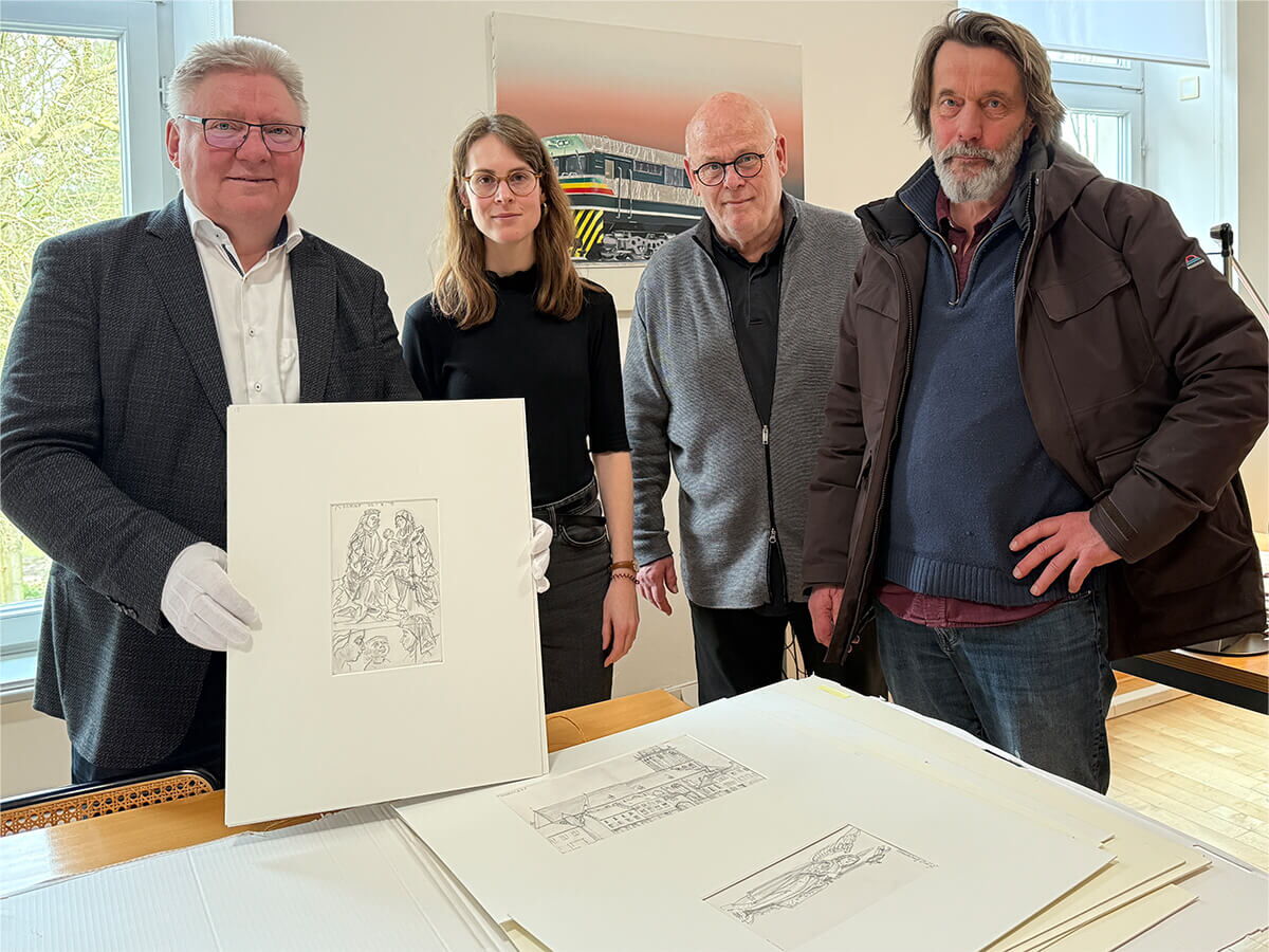 Abbildung: Harald Kunde und Anke Ehring (Museum Kurhaus) freuen sich über die Schenkung des Zeichners Ben Luderer, die Jan Wieger van den Berg (rechts) an Hubert Wanders (2.v.r.) für den Freudeskreis Klever Museen übergab. (Foto: Freundeskreis)