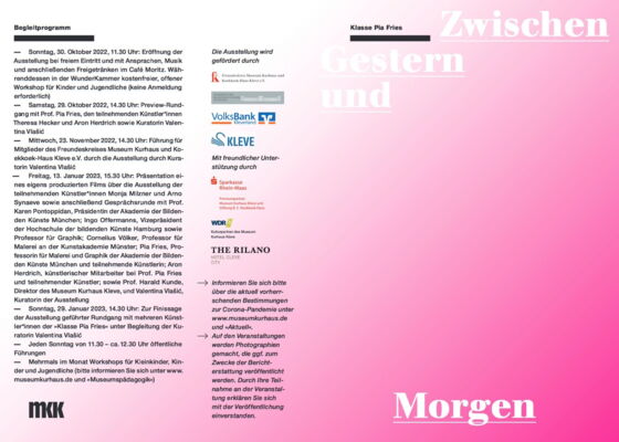 Studierende der Klasse Prof. Pia Fries von der Akademie der Bildenden Künste in München eröffnen im Museum Kurhaus Kleve eine Ausstellung mit ihren Werken eröffnen, die sie fast über ein Jahr lang vorbereitet und vor Ort in Kleve selbst eingerichtet haben.
