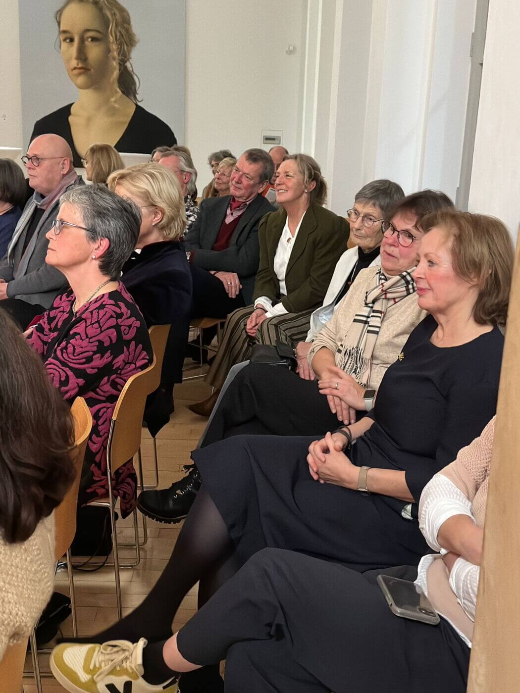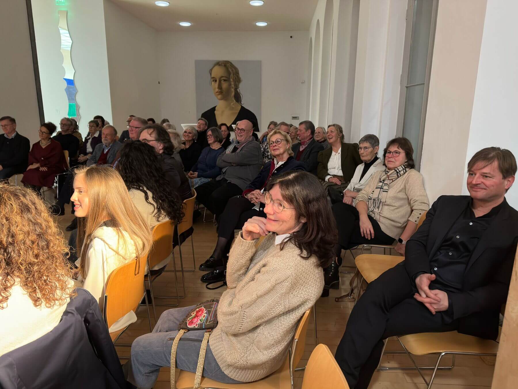 Das Hochzeitszimmer im Friedrich-Wilhelm-Bad bot den stimmungsvollen Rahmen für das Gesang Ensemble der Musikschulen des Kreises Kleve unter Leitung von Franziska Dieckmann mit Jurij Roganskij, Yeva Shyrobokova, Yelisei Shyrobokov und Emely Minervini, an der Gitarre begleitet von Margot Dellmann-Storm. Danach gab Valentina Vlašić Einblicke in die künstlerischen Gedanken, die Studierende der Kunstakademie München (Klasse Pia Fries) bei einem Projekt im Museum Kurhaus entwickelt haben (Zur Ausstellung: Zwischen Gestern und Morgen, Klasse Pia Fries).