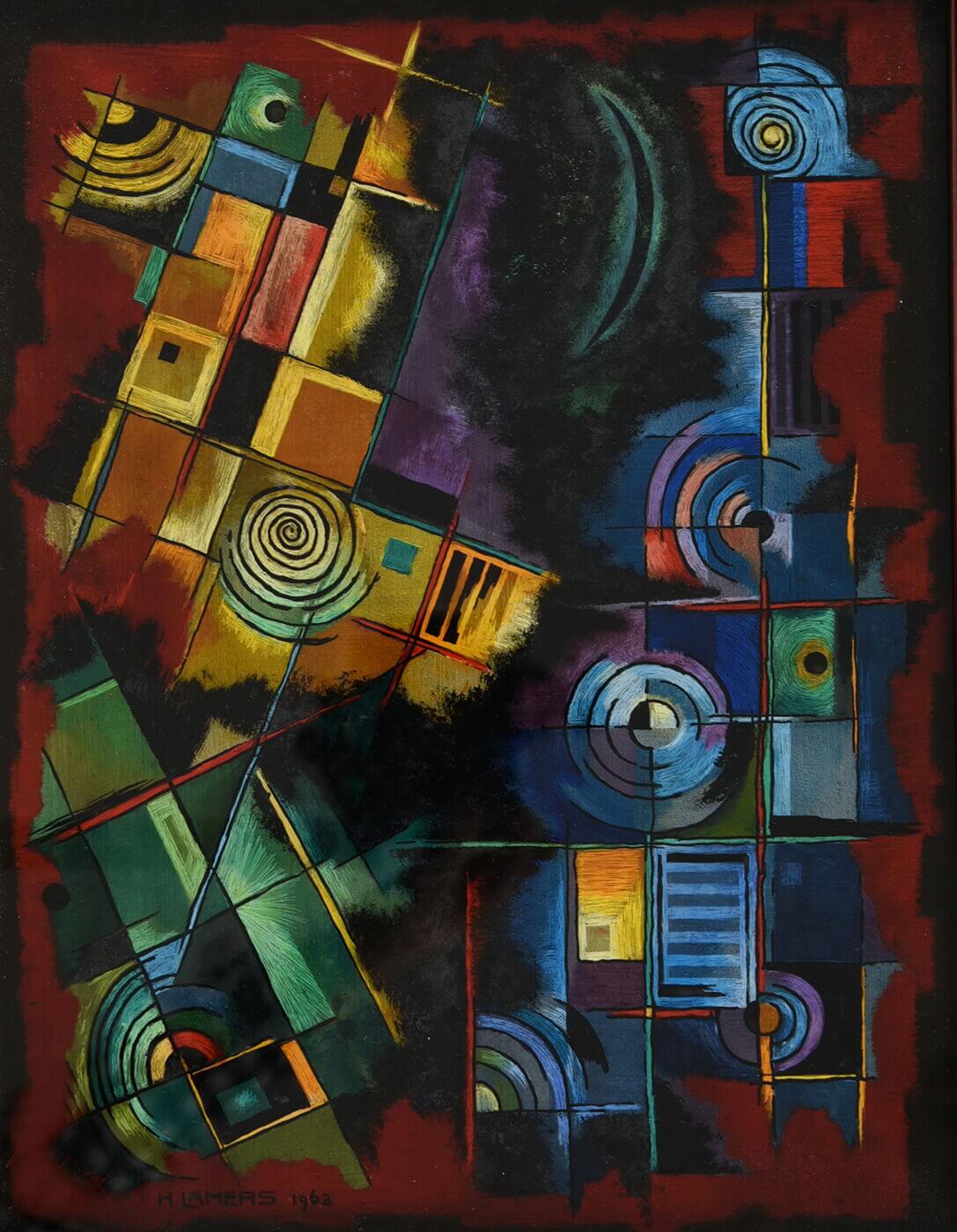 Das Bild "Mond und Sonnen" aus der Sammlung des MKK (Inv.2021-09-02 / Foto A. Gossens) entstand 1963 in der Technik der Hinterglasmalerei.