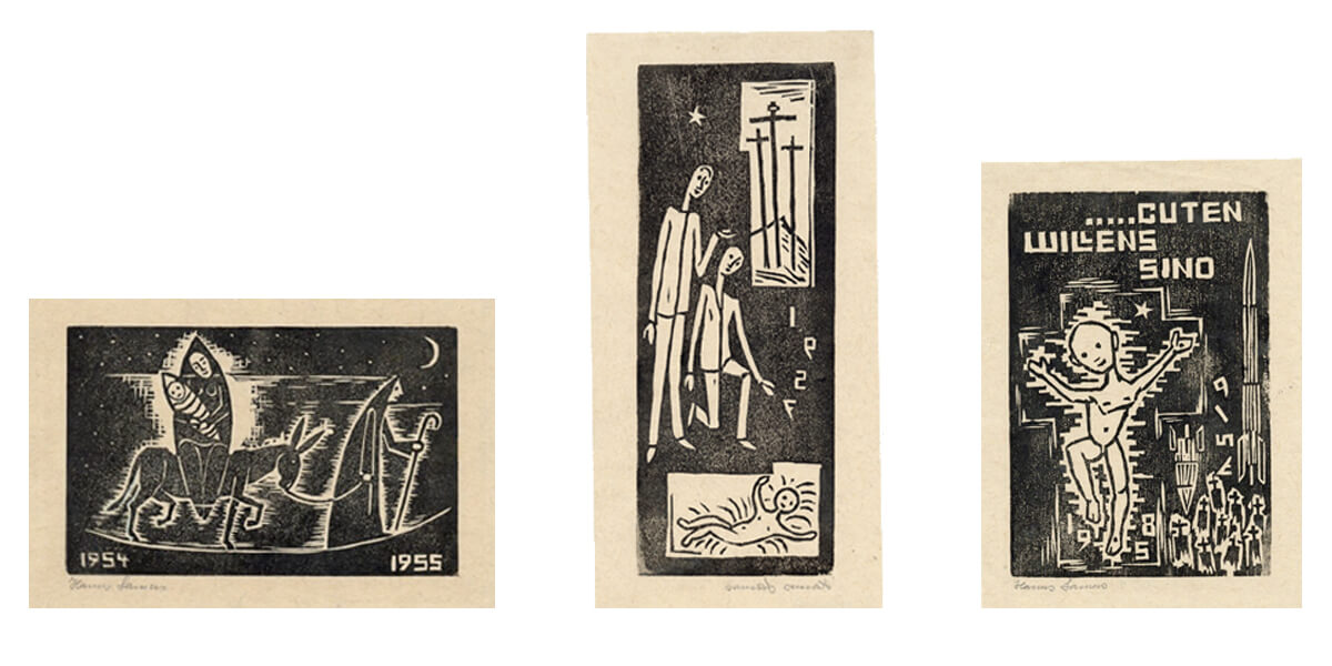 Zum Jahreswechsel gestaltete Hanns Lamers ab 1947 Holzschnitte, die seine Hoffnung und seinen Wunsch nach Frieden ausdrückten. Zwei Weltkriege haben ihn geprägt. In den Ersten Weltkrieg zog er als Zwanzigjähriger und mit 42 musste er nochmals Soldat werden, sechs Jahre lang. Mit einem Hörschaden kam er 1945 aus Russland zurück.