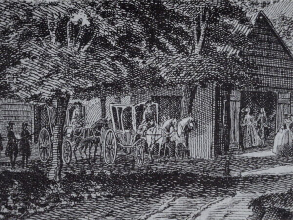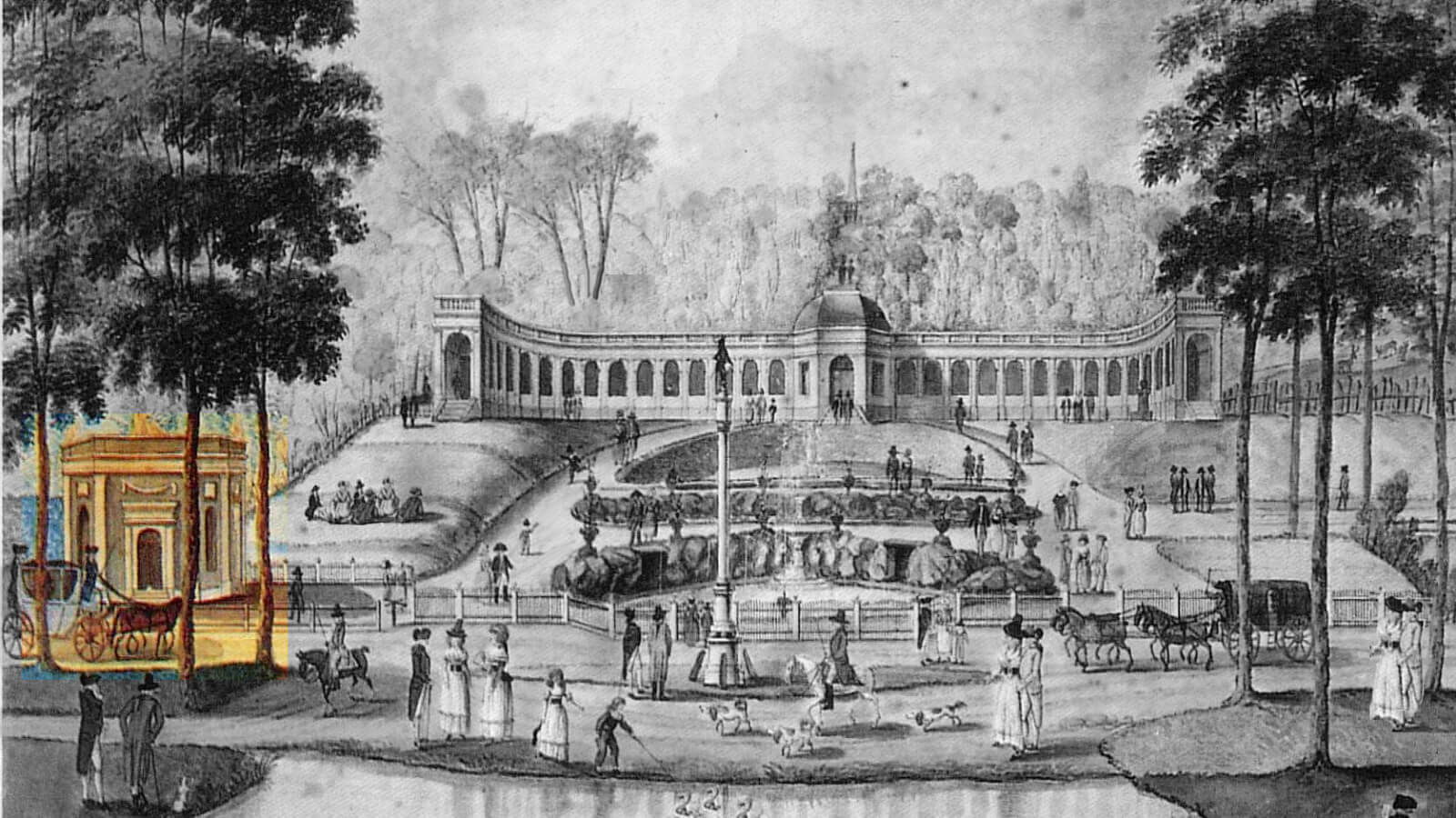 Das Bild zeigt farbig das Brunnenhaus von 1754 am linken Bildrand.