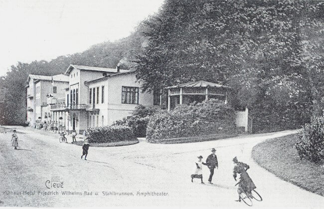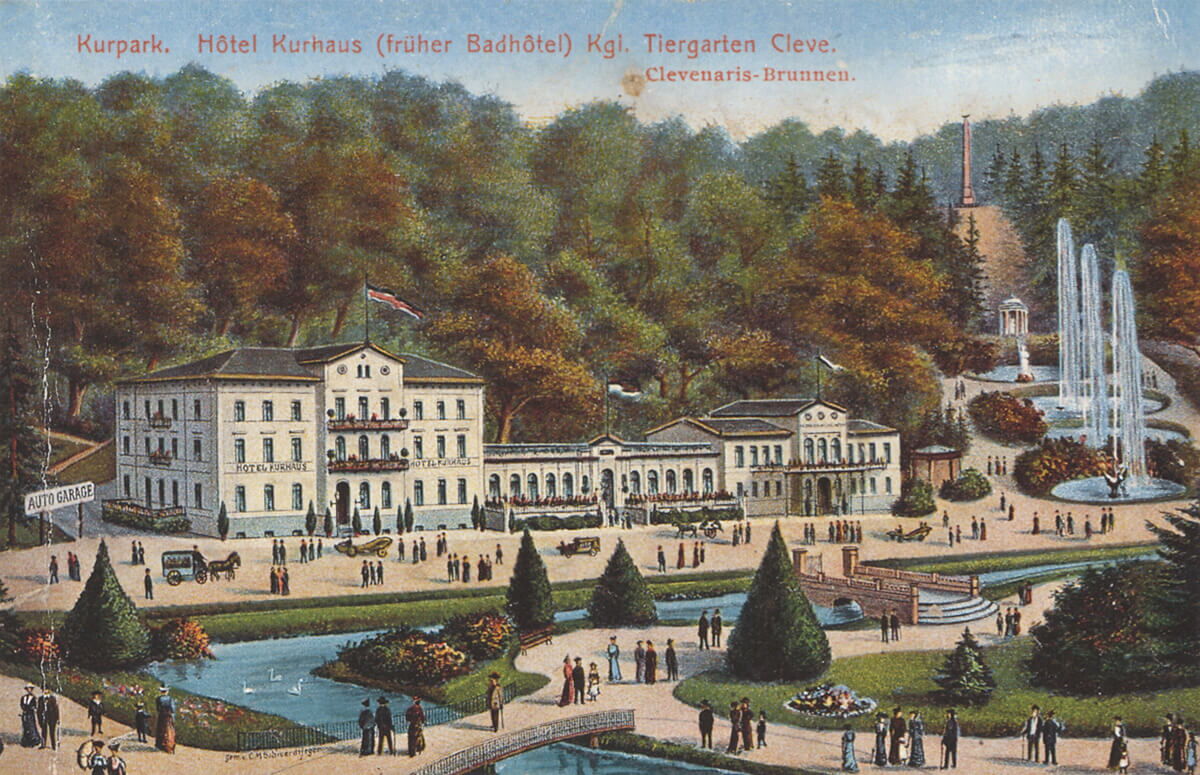 Neben dem Kurhaus ist rechts der als Pavillon errichtete Stahlbrunnen der Klever Heilquelle zu sehen, der nach Abbruch des alten Brunnenhauses entstand. Daneben sind die Teiche der Gartenanlagen, die Johann Moritz anlegte, zu erkennen.