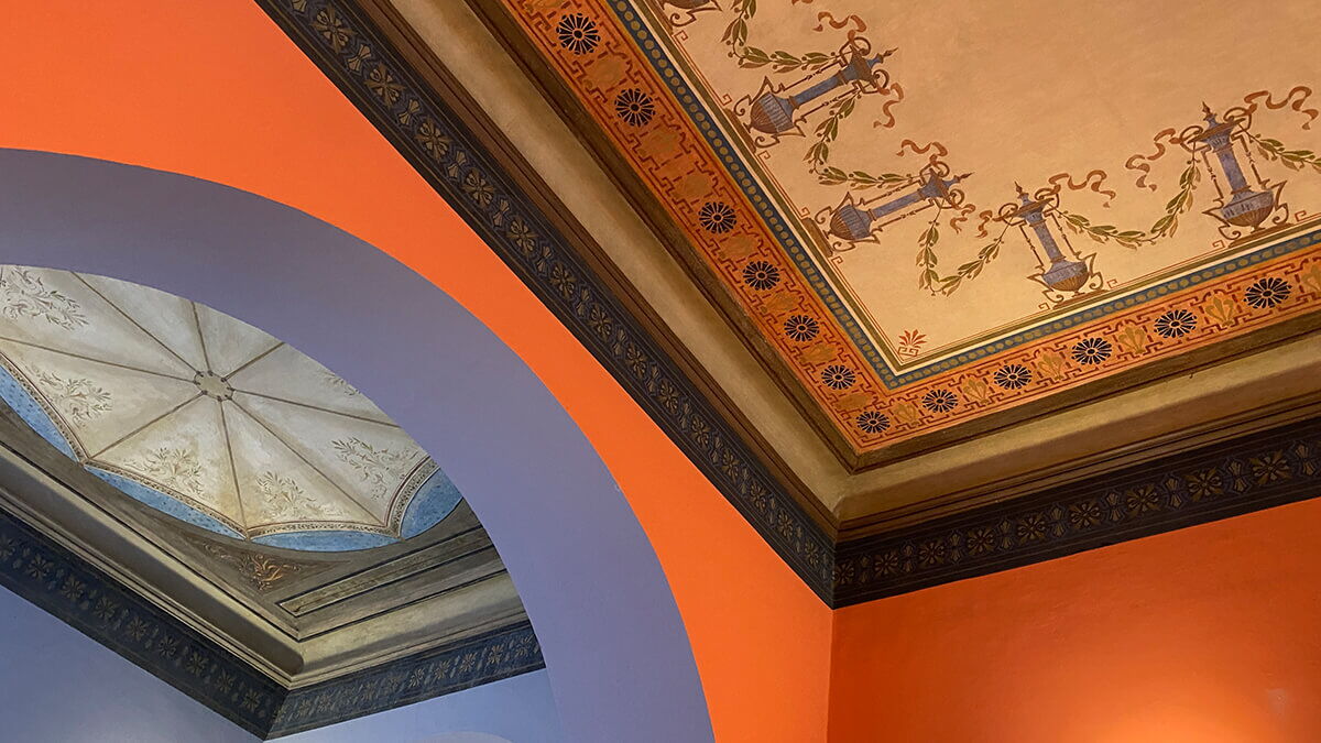 Dieser Raum mit der alten Wandmalerei ist einer der Salons der „Belle Etage“, der schönen Etage.