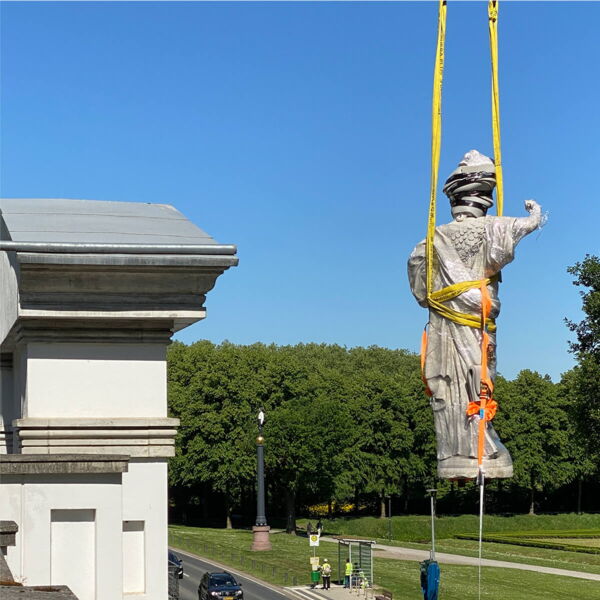 Für ein paar Monate bleibt der Platz vor der bogenförmigen Wand leer. Die Bilder zeigen wie die über 1000 kg schwere Marmorskulptur der „Pallas Athene“ für eine Ausstellung nach Amsterdam abgeholt wurde.