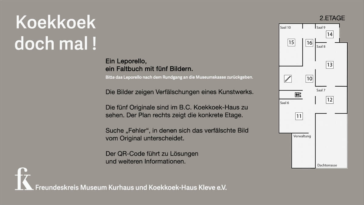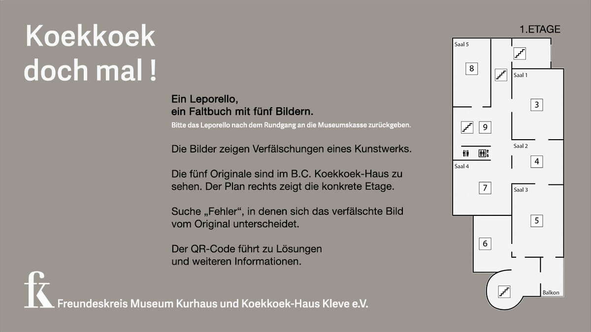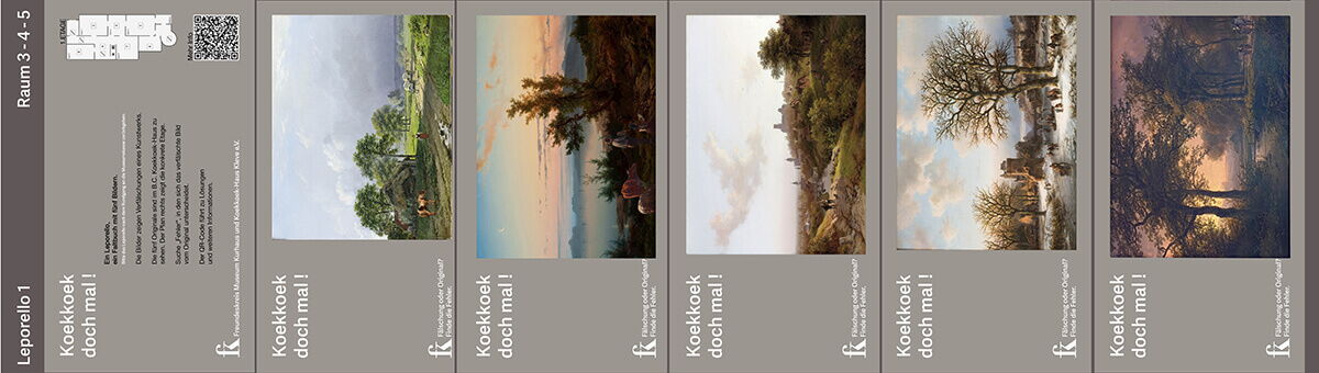 - Jedes Leporello zeigt Abbildungen von fünf Kunstwerken aus dem B.C. Koekkoek-Haus. Ein Plan zeigt im Leporello die Räume, wo sie zu finden sind.