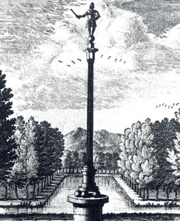 Der Eiserne Kriegsgott Mars soll in der Rüstung des Martin Schenck von Nideggen, des Erbauers der Festung Schenkenschanz, auf der Säule gestanden haben. Dieses Siegeszeichen (Tropaion) errichtete Johann Moritz 1653 nach den Wirren des Dreißigjährigen Krieges, om voor een teycken van den soeten vreed te groeten (Maria van Akerlaeken, 1653).