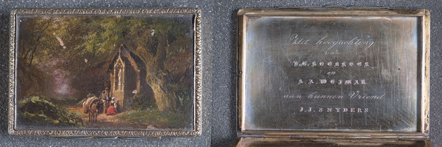 Gegenüber vom größten Bild Koekkoeks, der "Großen Waldlandschaft", liegt in einer Vitrine das kleinste bekannte Gemälde von B.C. Koekkoek, die Miniatur auf einer Schnupftabakdose.