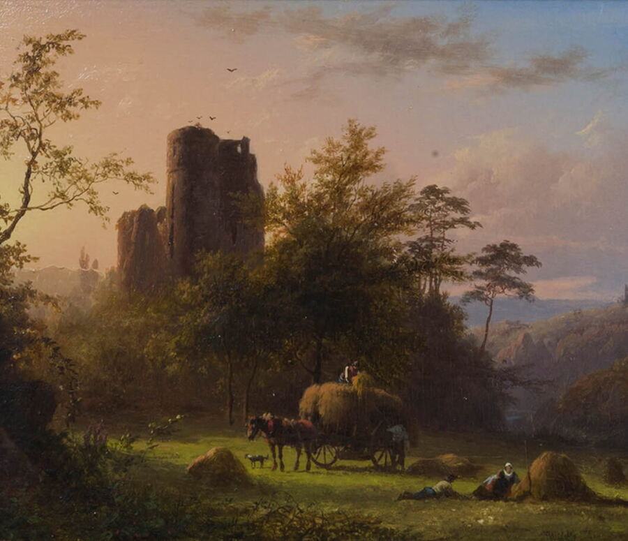 BCKH / Leihgabe; erworben 2024 durch die Nordrhein-Westfalen-Stiftung Naturschutz, Heimat- und KulturpflegeWeil der preußische König 1845 beim Besuch einer Ausstellung im Klever Rathaus von einem Bild "Heuernte" so begeistert war, zog B.C. Koekkoek einen Verkauf dieses Gemäldes an einen Sammler zurück, malte diesem Sammler ein neues, kleineres Bild mit gleichem Motiv und überließ das Original dem König.