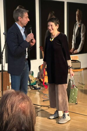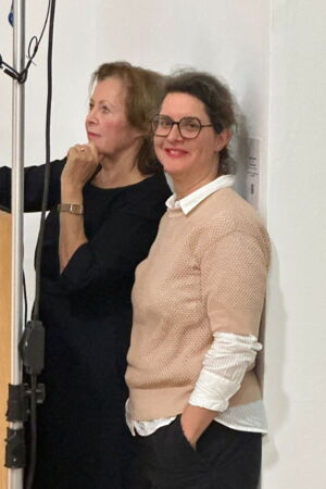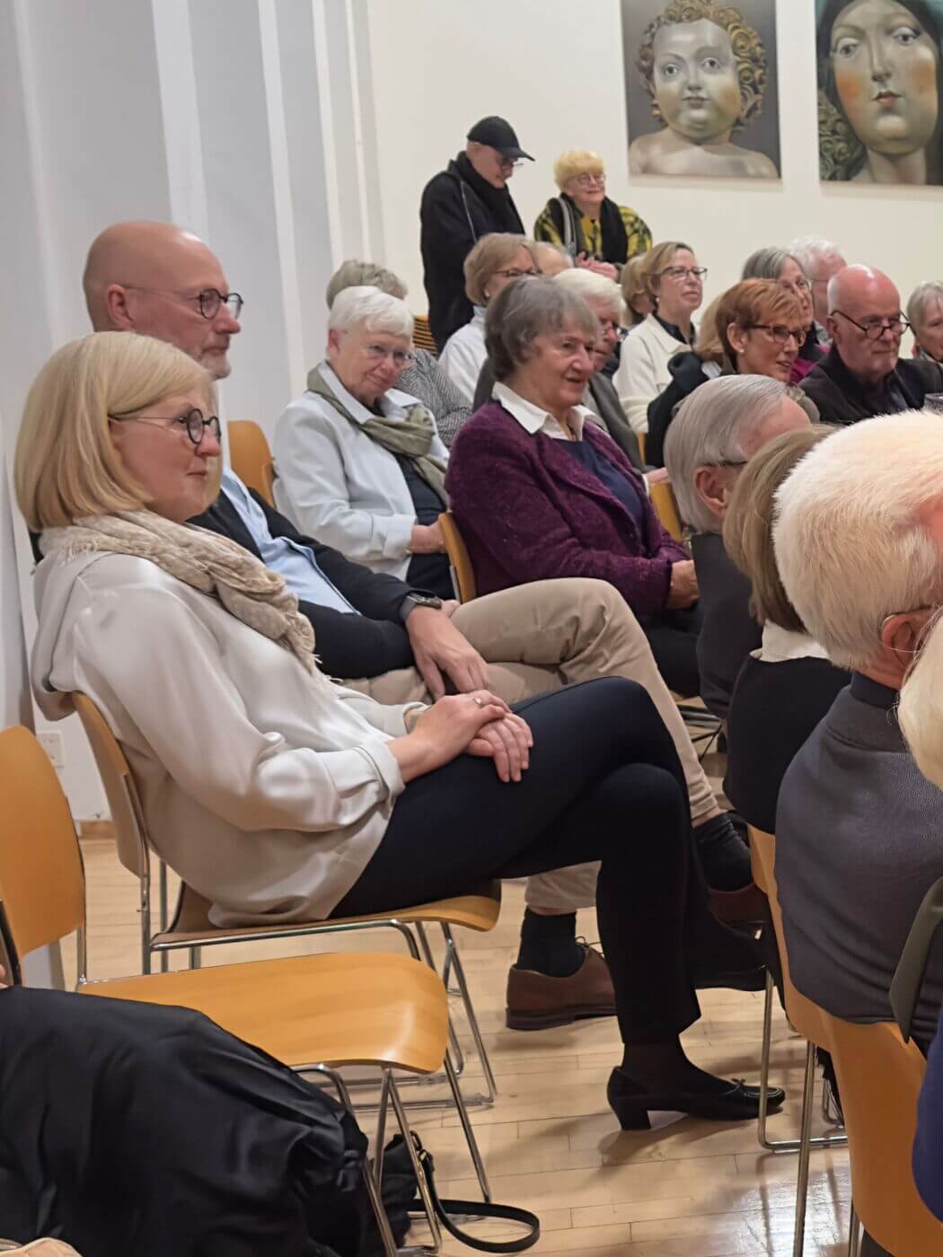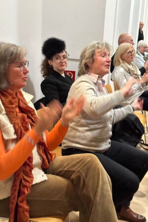 Das Hochzeitszimmer im Friedrich-Wilhelm-Bad bot den stimmungsvollen Rahmen für das Gesang Ensemble der Musikschulen des Kreises Kleve unter Leitung von Franziska Dieckmann mit Jurij Roganskij, Yeva Shyrobokova, Yelisei Shyrobokov und Emely Minervini, an der Gitarre begleitet von Margot Dellmann-Storm. Danach gab Valentina Vlašić Einblicke in die künstlerischen Gedanken, die Studierende der Kunstakademie München (Klasse Pia Fries) bei einem Projekt im Museum Kurhaus entwickelt haben (Zur Ausstellung: Zwischen Gestern und Morgen, Klasse Pia Fries).